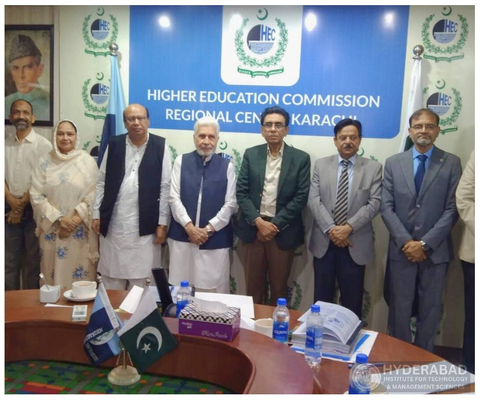 The meeting was attended by distinguished members including Prof. Dr. Saeeduddin (Rector, HITMS), Prof. Dr. Syed Iqleem Haider (Registrar), Prof. A.Q. Mughal (Former Vice Chancellor, Sindh Agriculture University), Prof. Dr. Abdul Qadeer Rajput (Former Vice Chancellor, Mehran University of Engineering and Technology, Jamshoro), Mr. Adeel Siddiqui (President, Chamber of Commerce), Ms. Rana Ansar (Member, National Assembly), and Dr. Nasir Ansar.